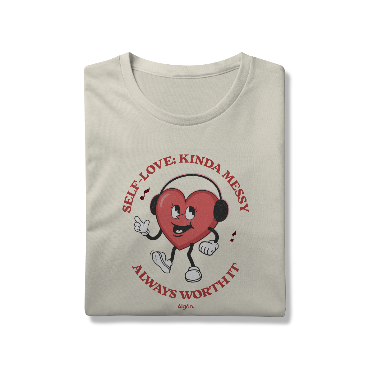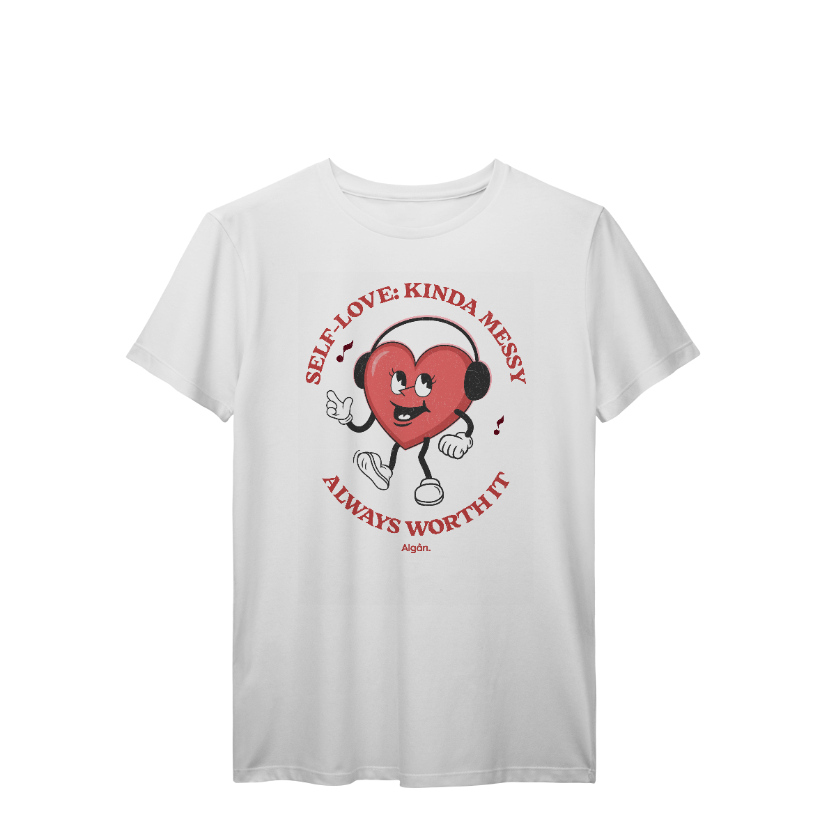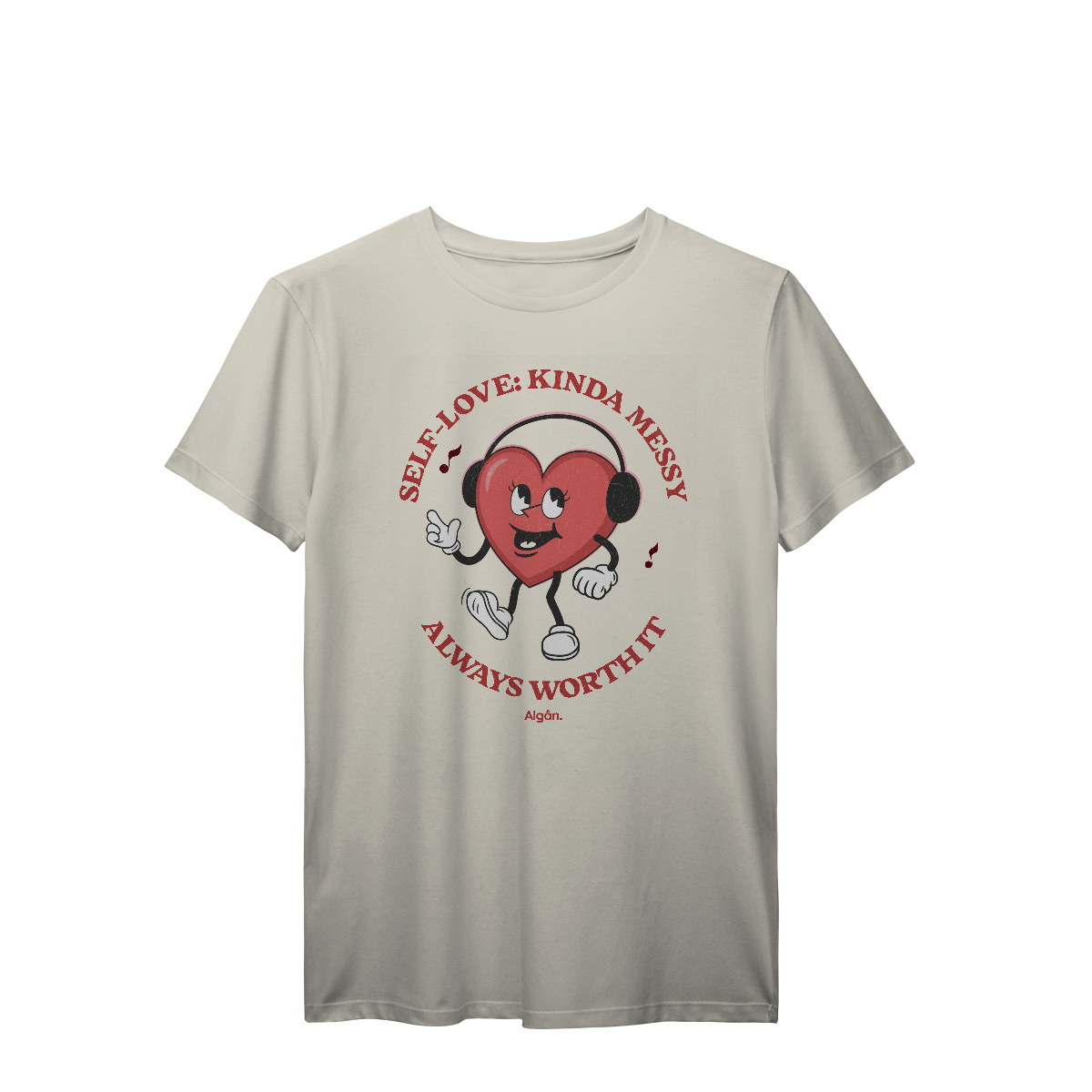 Essa camiseta da Algân. traduz com bom humor o desafio (e o prazer) de se amar do jeitinho que a gente é. Com estampa vintage e um coração que dança ao som do próprio ritmo, ela é perfeita pra quem vive esse rolê interno com coragem e leveza.
